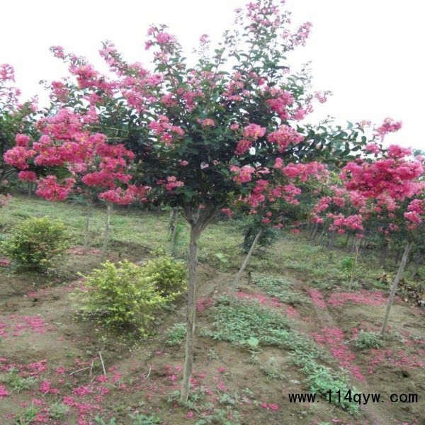 紫薇,別名:癢癢花、癢癢樹、紫金花、紫蘭花、蚊子花、西洋水楊梅、百日紅、無皮樹,拉丁文名:Lagerstroemia indica L. 千屈菜科、紫薇屬落葉灌木或小喬木,高可達7米;樹皮平滑,灰色或灰褐色;枝干多扭曲,小枝纖細,葉互生或有時對生,紙質,橢圓形、闊矩圓形或倒卵形,幼時綠色至黃色,成熟時或干燥時呈紫黑色,室背開裂;種子有翅,長約8毫米。花期6-9月,果期9-12月。紫薇樹姿優美,樹干光滑潔凈,花色艷麗;開花時正當夏秋少花季節,花期長,故有“百日紅”之稱,又有“盛夏綠遮眼,此花紅滿堂”的贊語,是觀花、觀干、觀根的盆景良材;根、皮、葉、花皆可入藥。