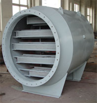 本型式消聲器(風機消聲器)系列產品為阻抗聲流型。本廠根據對發電廠各類風機運行現場噪聲源進行實際測試所取得的瀕特性資料來確定在哪些頻譜范圍內需要多大消聲量作為設計吸聲片結構及流體通道的主要依據,同時采用了具有較大吸聲材料飾面的狹矩形通道,以增強吸收效果。我們知道,風機的噪聲源在最大噪聲級時,其頻譜值往往不止一種,而對不同頻譜帶,對其消聲量要求也不相同。為此本產品采用了對高、中頻噪聲起消聲作用的阻式結構及對中、低頻噪聲起消聲作用的抗式結構,同時在阻式通道中采用了高頻及低頻兩種消聲區,用以最大限度的增寬消聲頻帶,以實現良好的消聲效果。